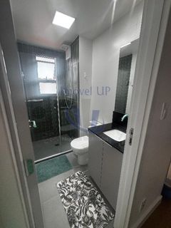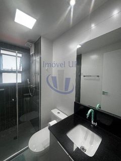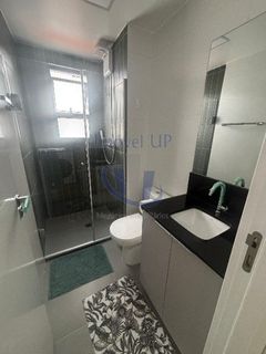 Banheiro com ventilação natural, box de vidro, espelho e armário moderno