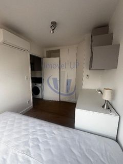 Quarto bem iluminado com janela, ar-condicionado, cama de solteiro king com baú, armários planejados e escrivaninha.